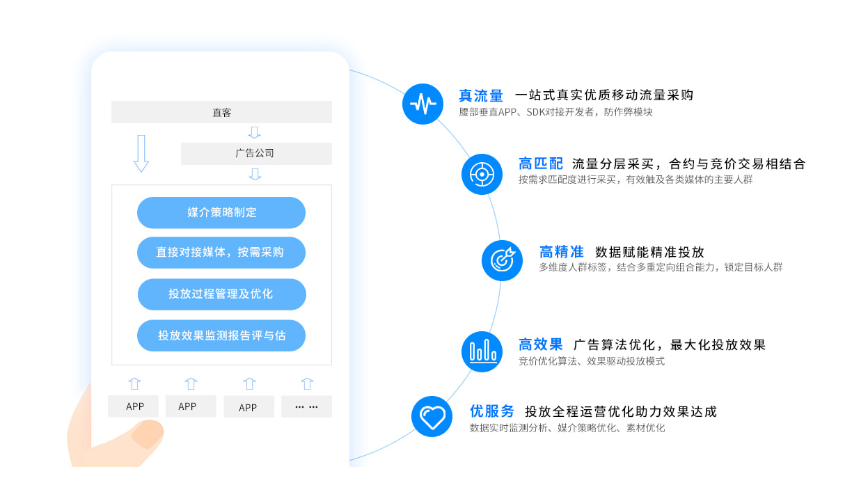全面響應廣告主訴求,從(cóng)策略制(zhì)定到(dào)人(rén)群挖掘、媒體(tǐ)采購(gòu),投放(fànδg)優化(huà)等各階段,滿足廣告主各類需求